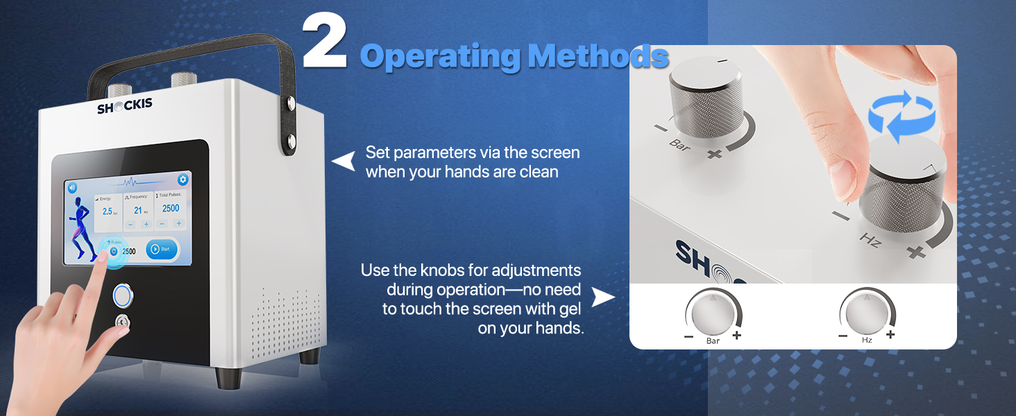 𝐃𝐮𝐚𝐥 𝐎𝐩𝐞𝐫𝐚𝐭𝐢𝐨𝐧 𝐒𝐲𝐬𝐭𝐞𝐦: Features a 7-inch responsive touchscreen paired with a precision control knob for fast adjustments. The dual-control system allows effortless parameter tuning — even when gel is on your hands. The included 6ft therapy cable provides extended reach, making treatment more flexible in any position.